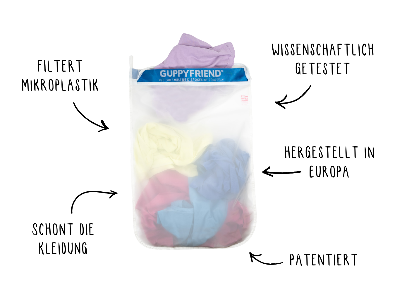 Synthetische Textilien verlieren beim Waschen Plastikfasern, die über das Abwasser in der Natur landen. Mit dem GUPPYFRIEND Waschbeutel kannst du das ganz einfach verhindern.