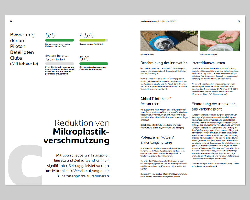 Wir entwickeln maßgeschneiderte Produktlösungen für relevante Mikroplastikquellen in Sportstätten, die auf den jeweiligen Einsatzort, Art und Menge des Mikroplastiks abgestimmt sind. Ziel ist es, den Austrag von Mikroplastik im optimalen Kosten-Nutzen-Verhältnis messbar zu reduzieren.